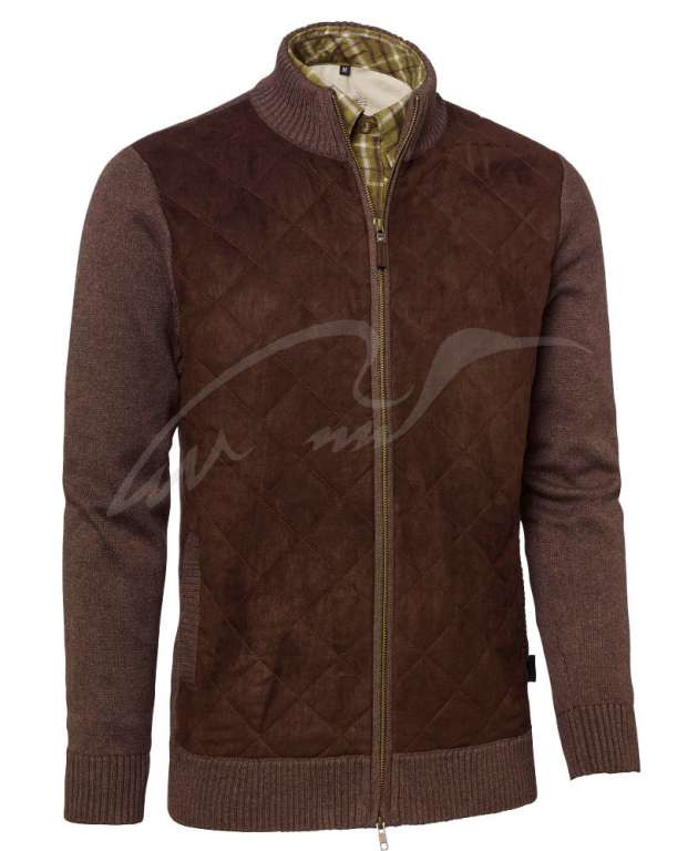 Класичний вязаний кардиган, який можна носити як в місті, так і на полюванні. Фронтальна частина оброблена замшевою матеріалом і простібана. Високий воріт добре захищає від вітру, а м'яка внутрішня обробка створює відчуття затишку. Светр застібається на подвійну надійну «блискавку» Є два бокових врізних кишені.