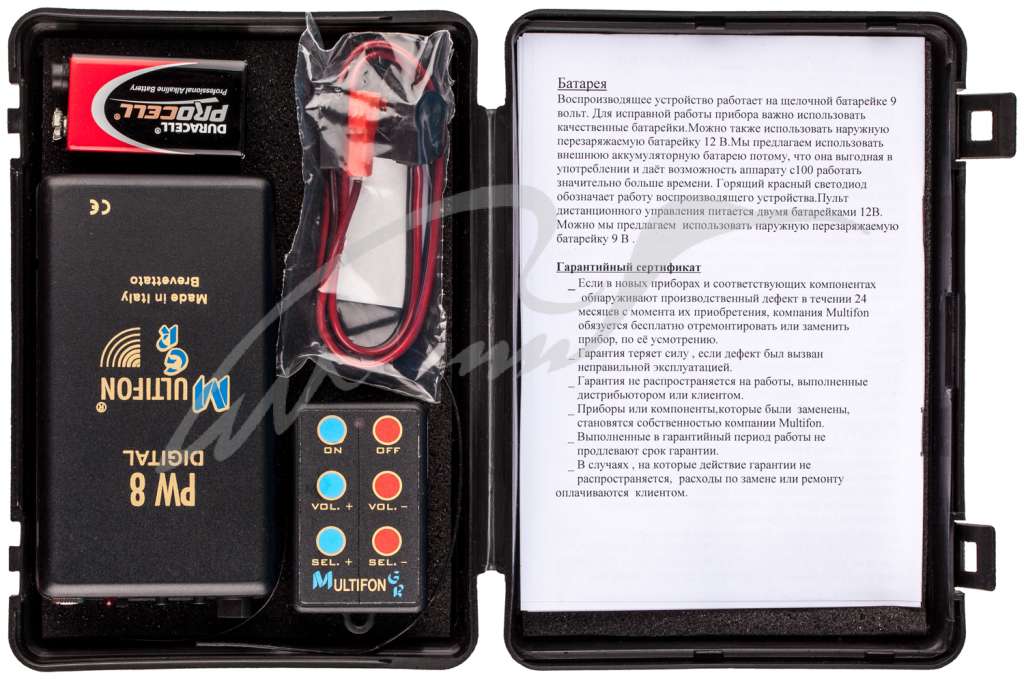 В комплект манка Multifon Digital PW8 входить дистанційне управління, яке працює на відстані до 50м. Флеш-карта (карта знімається легким натисканням на неї), кабель зовнішнього живлення, футляр та валізку. Дистанційне керування дозволяє перемикати пісні, регулювати гучність відтворення, включати і вимикати манок.