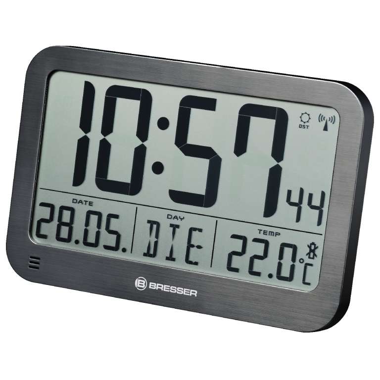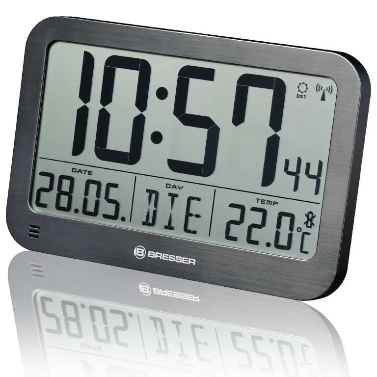 Настенные часы Bresser MyTime MC с цифрами высотой 6 см идеально подходят для офисов и других больших помещений. Благодаря большим цифрам время хорошо видно с большого расстояния. Не смотря на то, что это настенные часы, они имеет подставку, позволяющую установить их на столе или другой горизонтальной поверхности. Время и переход на летнее / зимнее время могут настраиваться автоматически, если прибор будет находиться в зоне приема сигнала точного времени DCF. Часы также показывают дату, день недели и температуру.