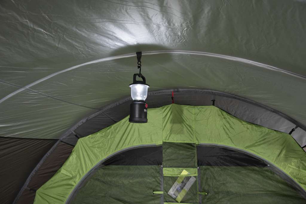 Вход на молнии позволяет проложить электрокабель внутрь палатки во время нахождения в кемпинговом лагере. Прочные стальные колышки диаметром 5 мм предназначены для твердого грунта. Проклеенные швы гарантируют прочность на разрыв и обеспечивают водонепроницаемость.