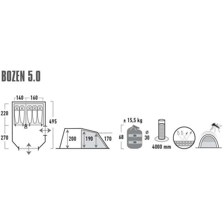 Новинка 2021 года! High Peak Bozen 5.0 - семейная туннельная палатка с двумя входами, просторной гостиной со вшитым полом, который обеспечивает защиту от назойливых насекомых и нежелательных сквозняков. Жилая зона с высотой потолка 2 м имеет достаточно места для размещения кемпинговых стульев, стола и походного снаряжения. Две сетчатые двери увеличивают приток свежего воздуха и защищают от насекомых. Прозрачные окна в жилой зоне наполнят помещение светом, а шторы при необходимости обеспечат уединение. Крыша имеет теплоотражающее алюминизированное покрытие, снижающее повышение температуры внутри палатки днем в солнечную погоду.