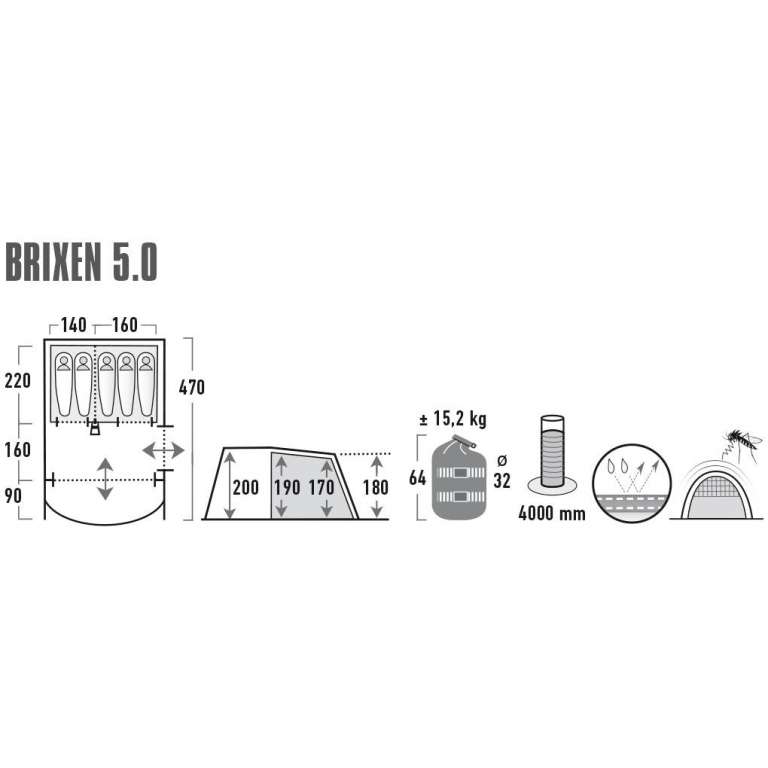 Новинка 2021 года! High Peak Brixen 5.0 - семейная туннельная палатка с двумя входами, гостиной со вшитым полом, который обеспечивает защиту от назойливых насекомых и нежелательных сквозняков. Интегрированный навес создает тень и помогает предотвратить попадание дождя внутрь при открывании двери. Жилая зона с высотой потолка 2 м имеет достаточно места для размещения кемпинговых стульев, стола и походного снаряжения. Сетчатое окно со шторой на фронтальных дверях обеспечивает постоянный приток свежего воздуха в палатку. Боковая сетчатая дверь увеличивает приток свежего воздуха и защищает от насекомых. Прозрачные окна в жилой зоне наполнят помещение светом, а шторы при необходимости обеспечат уединение. Крыша имеет теплоотражающее алюминизированное покрытие, снижающее повышение температуры внутри палатки днем в солнечную погоду.