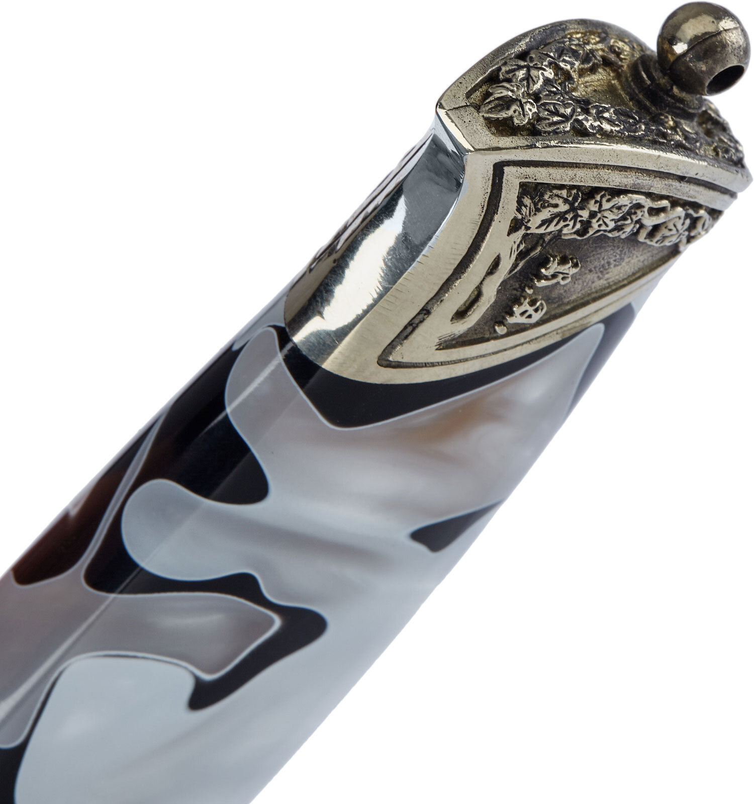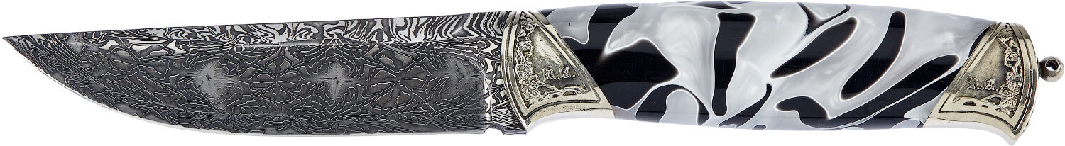 Мозаичный дамаск клинка в сочетании с причудливым узором полимерной рукояти – сразу видно, что перед вами нож «Отважный» из мастерской R.A.Knives. Навершие и больстер из мельхиора, украшены растительным орнаментом.