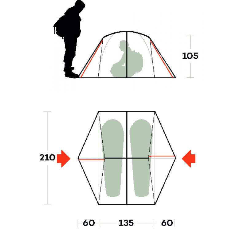 - Конструкция данной палатки является однослойной в торцах палатки и двухслойной по бокам, где размещены тамбуры. Такая конструкция помогает очень сщественно снизить вес и в значительной степени избежать проблем с конденсатом, присущим классическим однослойным палаткам.