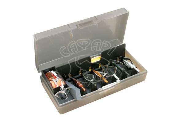 Коробка MTM Broadhead Accessory Box BH-1-41 призначена для укладання шести наконечників стріл, а також інших дрібних комплектуючих і аксесуарів. Розміри - 11,5х21х5 см. Виготовляється з ударостійкого пластику (поліпропілену).