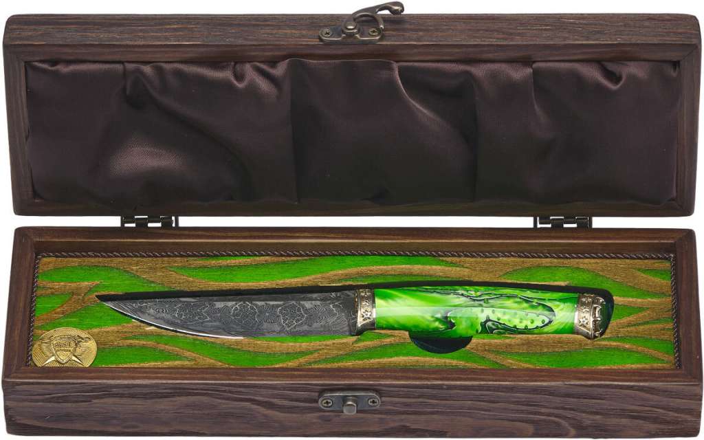 Нож поставляется в подарочной деревянной коробке, внутри которой присутствует медальон с логотипом мастерской и тематическая тканевая обивка.