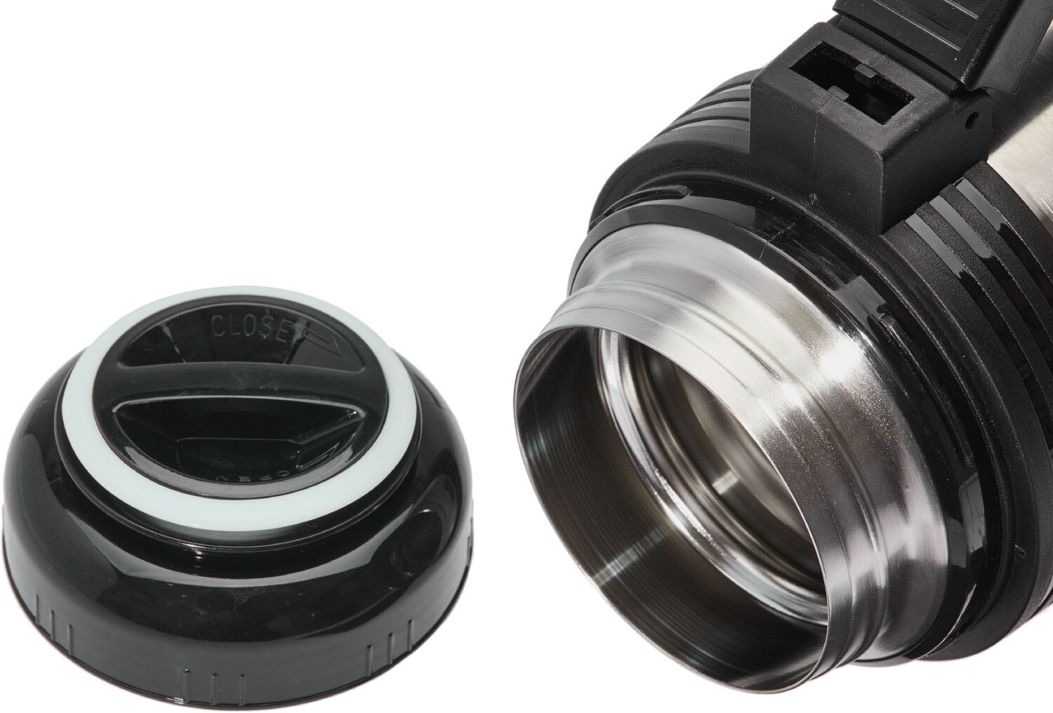Внутренняя поверхность крышки выполнена из высококачественного пищевого полимера, и может быть использована в качестве чашки. Также термос комплектуется дополнительной полимерной чашкой и съемным ремнем, и оборудован удобной ручкой.