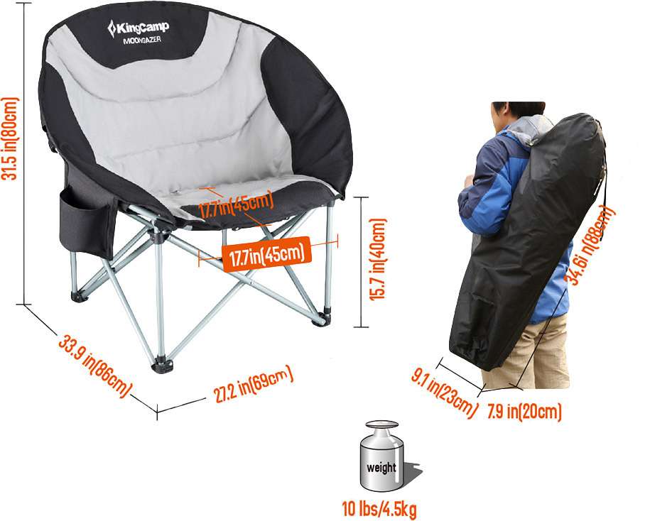 Кресло KingCamp Deluxe Moon Chair – надежное и практичное складное кресло круглой формы, предназначено для любителей отдыха на природе с комфортом. Отлично подойдет для пикника или длительного кемпингового отдыха. Устойчивость всей конструкции обеспечивает стальной каркас, который изготовлен из прочной стали, максимальный вес, который способно выдержать кресло 150 кг. Сиденье кресла сделано из нейлона разной плотности 300/600D Oxford, и имеет анатомическую форму. Сбоку предусмотрен тканевый карман для мобильного телефона. В собранном состоянии занимает немного места в багажнике автомобиля.