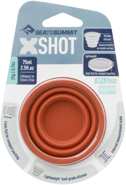 Стакан X-Shot – это складной сосуд со стенками из силикона. Его малый объем удобен для употребления кофе или алкогольных напитков. На стенках стакана нанесена мерная шкала, что позволяет использовать ее в качестве мерного стаканчика. Складывается в компактный диск, экономя место в рюкзаке. Выдерживает температуру от -40 до +180 градусов цельсия.