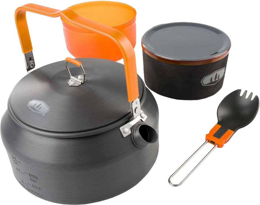 Набор посуды GSI Halulite Ketalist - компактный и универсальный набор, рассчитанный на одну или две персоны. В набор входит чайник объемом 1 литр, выполнен из высокопрочного и сверхлегкого анодированного алюминия. Предусмотрена удобная складывающаяся ручка с силиконовой накладкой, которая не нагревается, маленький размер носика обеспечивает компактность. В набор входит кружка с крышкой и неопреновой накладкой на стенках, также предусмотрена вторая чашка, которую можно использовать как глубокую миску. В набор также входит одна ловилка, в сложенном состоянии ее размер составляет всего лишь 3.9 см, а в разложенном - 15.5 см. Две чашки компактно складываются одна в другую и помещаются внутрь чайника, также объем чайника позволяет разместить 110 граммовый баллон с небольшой горелкой для удобства при транспортировке предусмотрен чехол. Баллон и горелка докупаются отдельно!