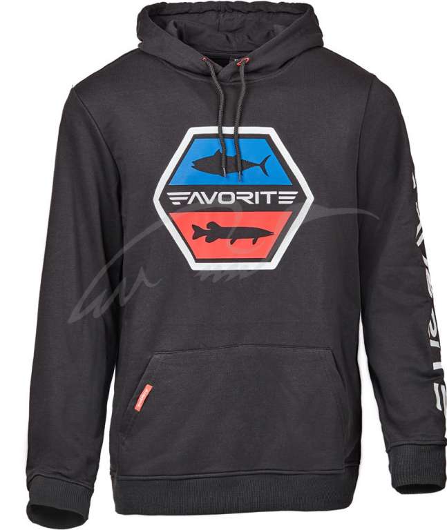 Реглан Favorite Hoodie – стильна фірмова кофта з капюшоном, яку можна носити не тільки на риболовлі, але і в повсякденному житті. Може використовуватися в якості верхнього одягу в осінньо-весняний період або як другий шар в більш прохолодну і вологу погоду. Матеріал складається з 70% бавовни, 25% поліестеру та 5% еластану, завдяки чому він дуже приємний до тіла і в міру тягнеться, не сковує рухів. У передній частині розташована велика двостороння кишеня для зігрівання рук. Капюшон оснащений затяжними шнурками для регулювання обсягу. Манжети та пояс еластичні, завдяки чому не будуть натискати під час носіння.