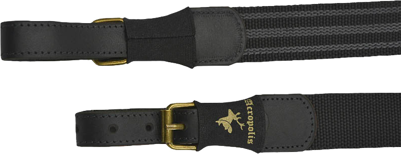 Оружейный ремень сделан из высококачественной стропы и кожаных элементов, а также имеет латексные дорожки по длине для предотвращения скольжения. Он фиксируется на антабки при помощи ремешков и пряжек, которые закрываются резинками для предотвращения трения об оружие. Ремень очень удобен и прекрасно перераспределяет вес оружия.