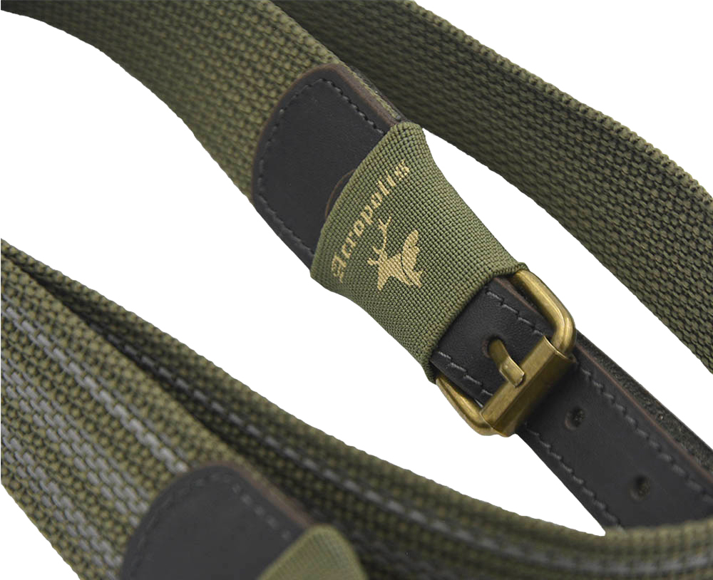 Оружейный ремень сделан из высококачественной стропы и кожаных элементов, а также имеет латексные дорожки по длине для предотвращения скольжения. Он фиксируется на антабки при помощи ремешков и пряжек, которые закрываются резинками для предотвращения трения об оружие. Ремень очень удобен и прекрасно перераспределяет вес оружия.
