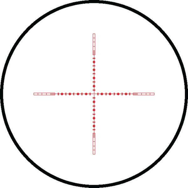 10х 1/2 Mil Dot IR - удобная универсальная сетка для максимально точного прицеливания на различных расстояниях. Главное отличие от обычной прицельной марки Mil Dot состоит в том, что тут имеются дополнительные пересечения, отмечающие пол мила. Все компоненты этой сетки имеют строго регламентированные размеры, расстояния между всеми элементами также регламентированы. Благодаря этому не проблема определить расстояние до цели либо размеры цели, приняв при этом правильную поправку на ветер и определить траекторию падения пули. Данный 1/2 Mil Dot верен при 10-кратном увеличении. Для других увеличений линейные и угловые размеры определяются методом интерполяции, либо по специальным таблицам. Персональную адаптацию сетки под конкретное оружие и тип снаряда позволит совершить бесплатный баллистический калькулятор X-ACT