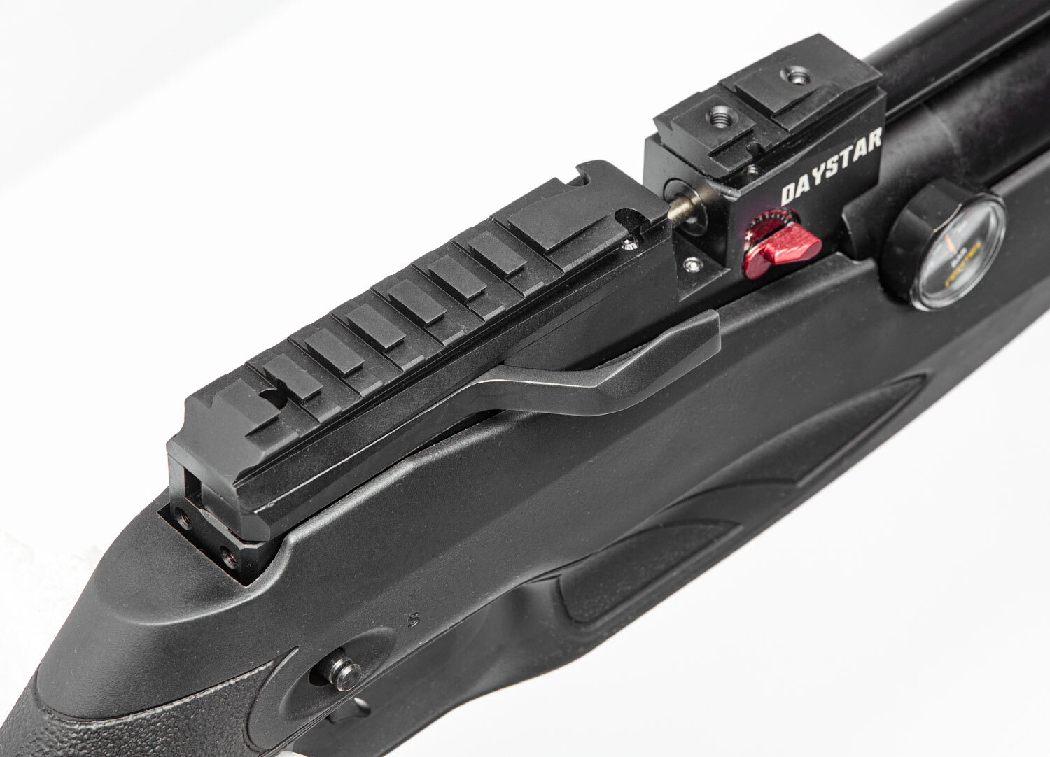 Daystar от Reximex это классическая и одновременно современная пневматическая винтовка с предварительной накачкой (PCP). Она имеет стандартную, для своего типа пневматики, комплектацию под стволом находится резервуар с воздухом, подача патронов осуществляется из роторного магазина.