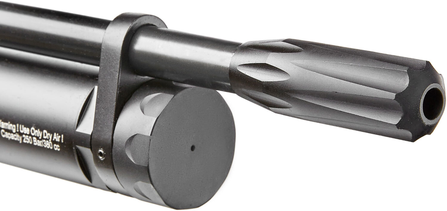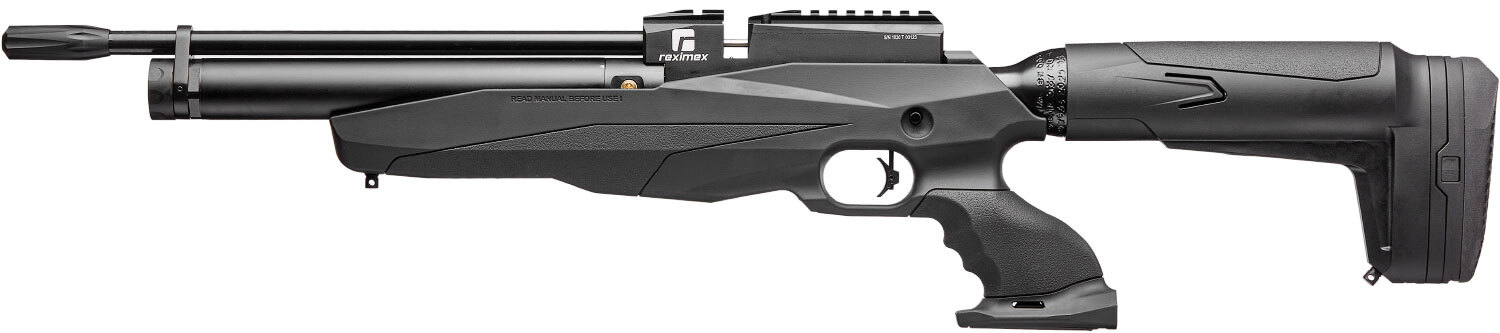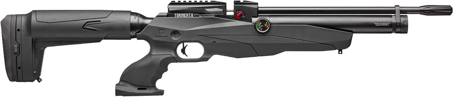 Reximex Tormenta - это пневматическая винтовка с предварительной накачкой (PCP). Особенностью конструкции данной винтовки является наличие двух баллонов, один из которых расположен под стволом, а другой с тыльной части и держит на себе приклад винтовки.