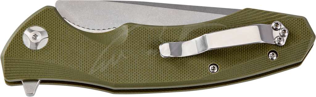 Накладки на рукоять выполнены из стеклотекстолита G-10. Присутствует стальная клипса для переноски ножа в положении Tip-up.