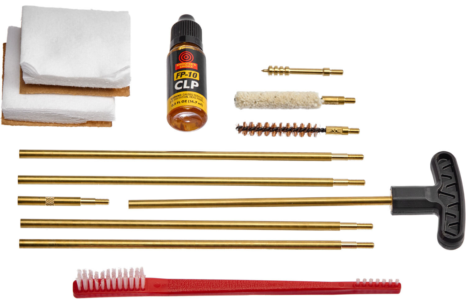 Набор состоит из латунного шомпола на 5 секций, бронзового и хлопкового ершей, вишер, универсальной нейлоновой щетки, сотни патчей и небольшой бутылочки фирменной смазки Shooter’s Choice FP-10 Elite. Набор расчитан на чистку оружия в калибрах: .30, .30-06, .303, .308, .300 Win. Mag., 7.62 мм, 8 мм.