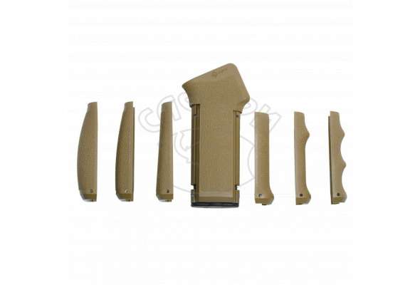 Комбінація форми і функціональності, яка не має собі рівних втілена в пістолетної рукоятці MFT для AK-47, 74, Сайга. Змінні текстуровані виступи для пальців (3 шт.) І задні накладки (3 шт.) Забезпечують надійне захоплення навіть мокрими руками або руками в рукавичках і дозволяють стрілку налаштувати індивідуальну підгонку зброї.