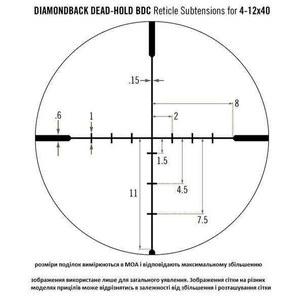 Оптические прицелы Vortex Diamondback - это сугубо охотничьи прицелы, полностью оправдывающие вложенные в покупку средства. Монолитная конструкция из авиационного сплава алюминия делает прицелы этой серии практически неуязвимыми для мощной отдачи винтовок магнум калибра. Заполненные изнутри аргоном вместо привычного азота, прицелы Vortex Diamondback напрочь исключают запотевание оптики при перепадах температур. Полностью многослойно просветленная оптика с широкоугольным окуляром удивит четкой и светлой передачей изображения и широким полем зрения, которые едва ли можно ожидать от прицелов данной ценовой категории. Премиум компоненты, использованные в механизмах трансфокатора и внесения поправок, делают процесс смены увеличения плавным, а процесс внесения поправок четким, повышая долговечность механизмов в целом. Универсальная прицельная сетка Dead-Hold BDC позволяет быстро определить траекторию падения пули на различных дистанциях и принять необходимые поправки по вертикали и горизонтали. Многоцелевой прицел Vortex Diamondback 4-12x40 (BDC) рекомендован для охоты на хищника и крупную дичь, он отлично подходит как для стрельбы из гладкоствольных дульнозарядных ружей и гладкоствольных ружей под патрон, так и для нарезных винтовок магнум калибра до .375 H&H Magnum включительно.