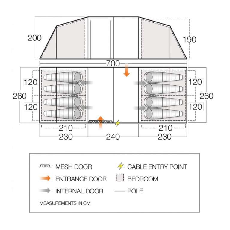 Встроенные люверсы позволяют использовать специальные телескопические стойки King Poles (не поставляются в комплекте) в виде опор для создания навеса от солнца над входом.