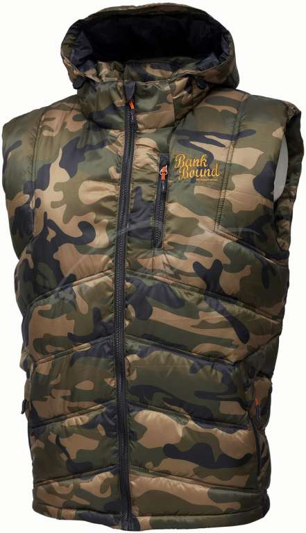 Bank Bound Thermo Carp Vest - удобная и теплая жилетка с капюшоном для длительных карповых сессий осенью и весной, выполненная из высококачественной полиэфирной ткани Taffetta с камуфляжным принтом. Застегивается на надежную молнию.