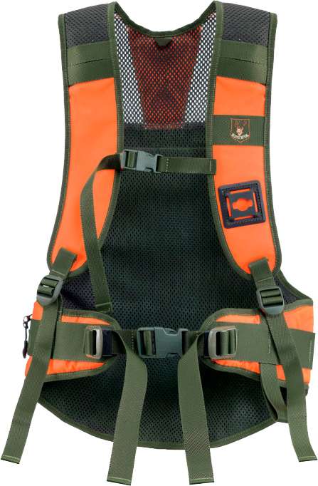 Скроен в максимально регулируемом формате, который позволяет надеть его даже поверх зимней одежды. Пояс, шлейки и дистанция между ними регулируемы и оснащены надежными фастексами. Основными материалами являются прочная техническая сеть и крепкий нейлон. Внешняя часть выполнена в ярком оранжевом цвете и имеет светоотражающие полосы, обеспечивающие безопасную охоту в условиях плохой видимости.