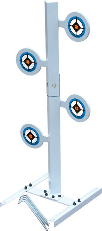RRDT45 - это мишенное устройство из стали с 4-мя круглыми целями (гонгами). Цели установлены на специальном возвратном запатентованном компанией механизме Tension Lock Technology™. Этот механизм обеспечивает стабильный возврат целей на место после отклонения при попадании в неё.