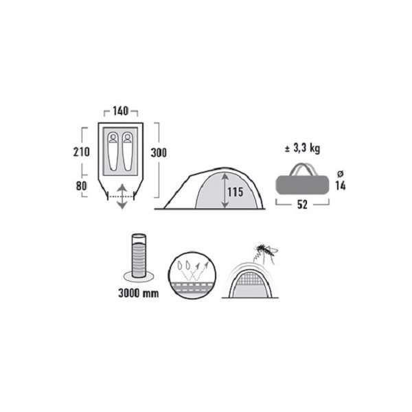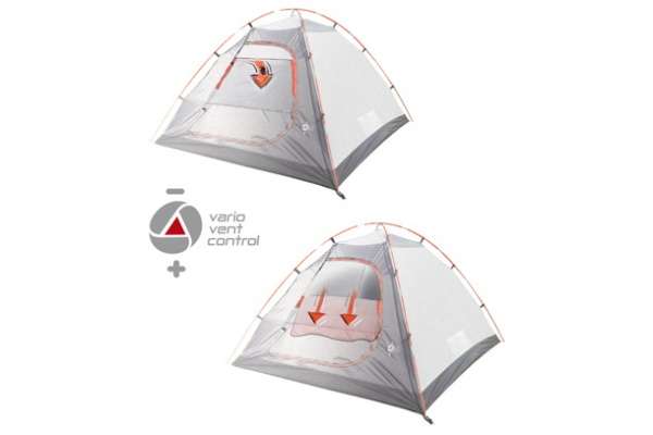 Современная туристическая, двухслойная, 2-х местная палатка High Peak Nevada. Удобный тамбур для вещей, защищенный от непогоды вход с антимоскитной сеткой, система вентиляции "Vario Vent Kontrol", простая установка.