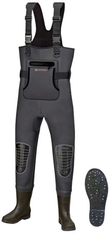 Вейдерсы Prox 3D Inner Chloroprene Wader обладают теплосберегающим эффектом, поэтому подойдут для использования в холодной воде весной и осенью. Они выполнены из материала W2 – хлоропрена (разновидность неопрена) с согревающей флисовой подкладкой. Благодаря такой структуре, рыболов может длительное время находиться в воде и не чувствовать дискомфорта, связанного с холодом. В нижней части находятся сапоги из эластичного ПВХ, подошва которых выполнена из войлока с вмонтированными шипами, обеспечивающими надёжное сцепление практически на любых поверхностях. Вейдерсы оснащены двумя наружными карманами – один с водонепроницаемой молнией для хранения вещей, а второй открытый для согревания рук. Регулируемые шлейки с застёжками позволяют удобно подстроить размер под свои параметры, чтобы они не сковывали движений. На коленях предусмотрены армированные вставки, защищающие основной материал от повреждений.