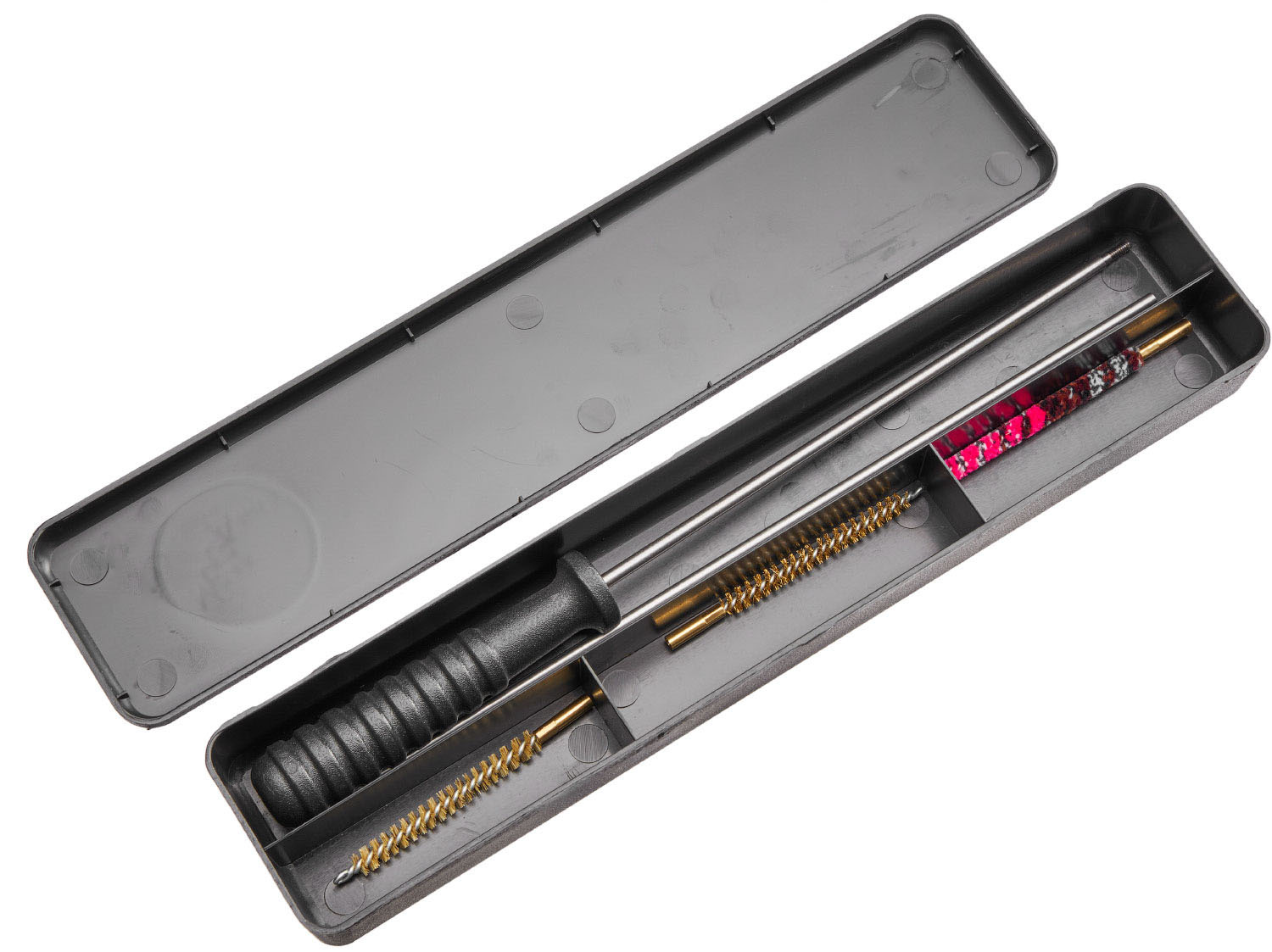 Набор MEGAline для чистки пневматической винтовки в калибре 4,5 мм. Набор содержит: - Пластиковая коробка с секциями внутри. - Шомпол с вращающейся пластиковой рукояткой, собирается из трёх секций. - Ёршики, 3 штуки: с хлопковым ворсом, нейлоновым и латунным.