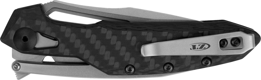 Рукоять с накладками из карбона выполнена в футуристическом стиле и имеет длинный бекспейсер, состоящий из двух боковых лайнеров и пластиковой вставки с надписью "Zero Tolerance", а также винта для упора клинка. Бекспейсер занимает пространство практически во всю длину обуха рукоятки и зафиксирован винтами и, по сути является ограничителем клинка при открытии клинка. Это означает, что клинок имеет наименьшее количество мест соприкосновения режущей кромки с деталями ножа в сложенном виде.