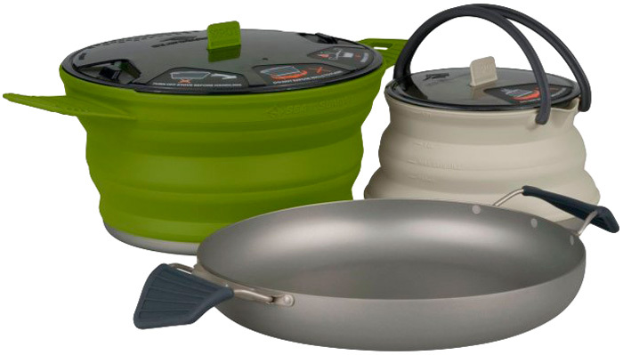 Набор складной посуды Sea To Summit X-Set – это ноу-хау в походной кухне от австралийской компании - производителя туристических товаров Sea To Summit. Если ранее походный набор посуды был громоздким и тяжелым, то Sea To Summit X-Set изменил это. Существует несколько вариантов наборов под различные требования пользователей. Стенки всех емкостей изготавливаются из пищевого термостойкого силикона. Они имеют ступенчатый профиль, что позволяет посуде компактно складываться, принимая форму диска. Основания чашек и тарелок выполнены из прочного пластика с технологией Protex с теплоизолирующими свойствами. Днища кастрюль, чайника и сковороды из алюминиевого сплава могут подвергаться нагреву прямым пламенем газовой горелки.