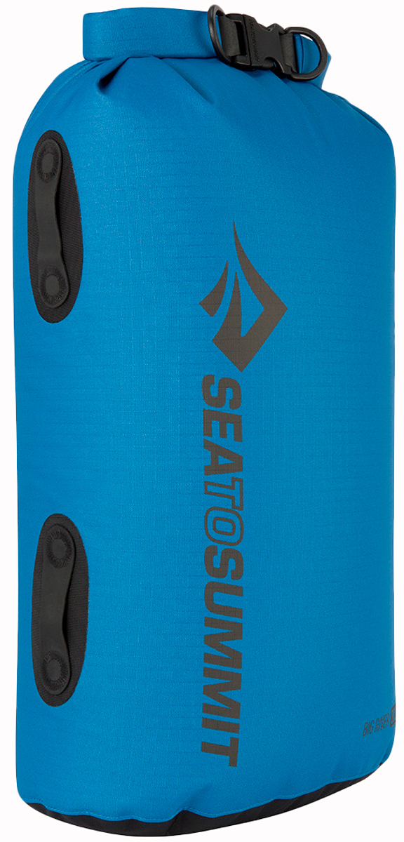 Гермомешок Sea To Summit Big River Dry Bag – непромокаемая упаковка для вещей, которые требуется сохранить сухими в походе или на рыбалке. Также с помощью гермомешка можно отделить уже промокшие вещи от сухих. Такой мешок просто необходим для любителей водного туризма, каякинга или рафтинга. Изготавливается из непромокаемого морозостойкого и стойкого к ультрафиолету высокотехнологичного материала Hypalon. Фурнитура – из авиационного алюминия. На моделях до объемом 13-ти литров с боков расположены по одной ручке для удобства переноски. Более объемные модели снабжены двумя парами аналогичных ручек.