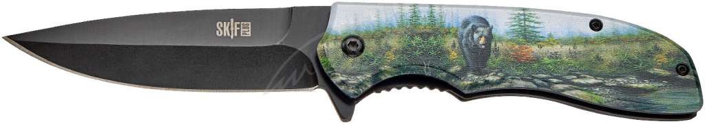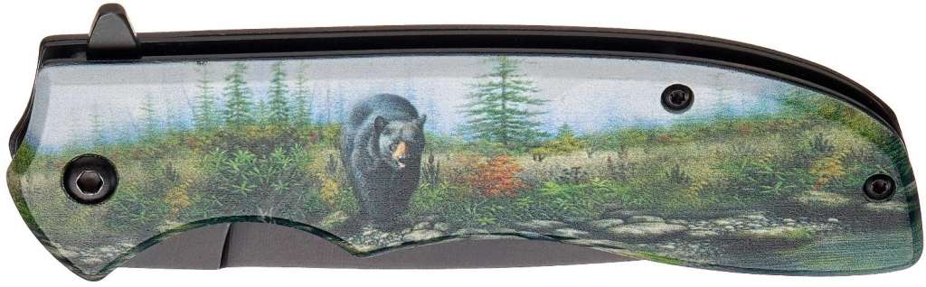 Рукоять удобной формы, прекрасно лежит в руке, имеет накладки из алюминия с чёрным покрытием, на одной из которых - цветное изображение медведя породы Кодьяк. В сложенном виде нож носится в положении tip-down на односторонней клипсе.