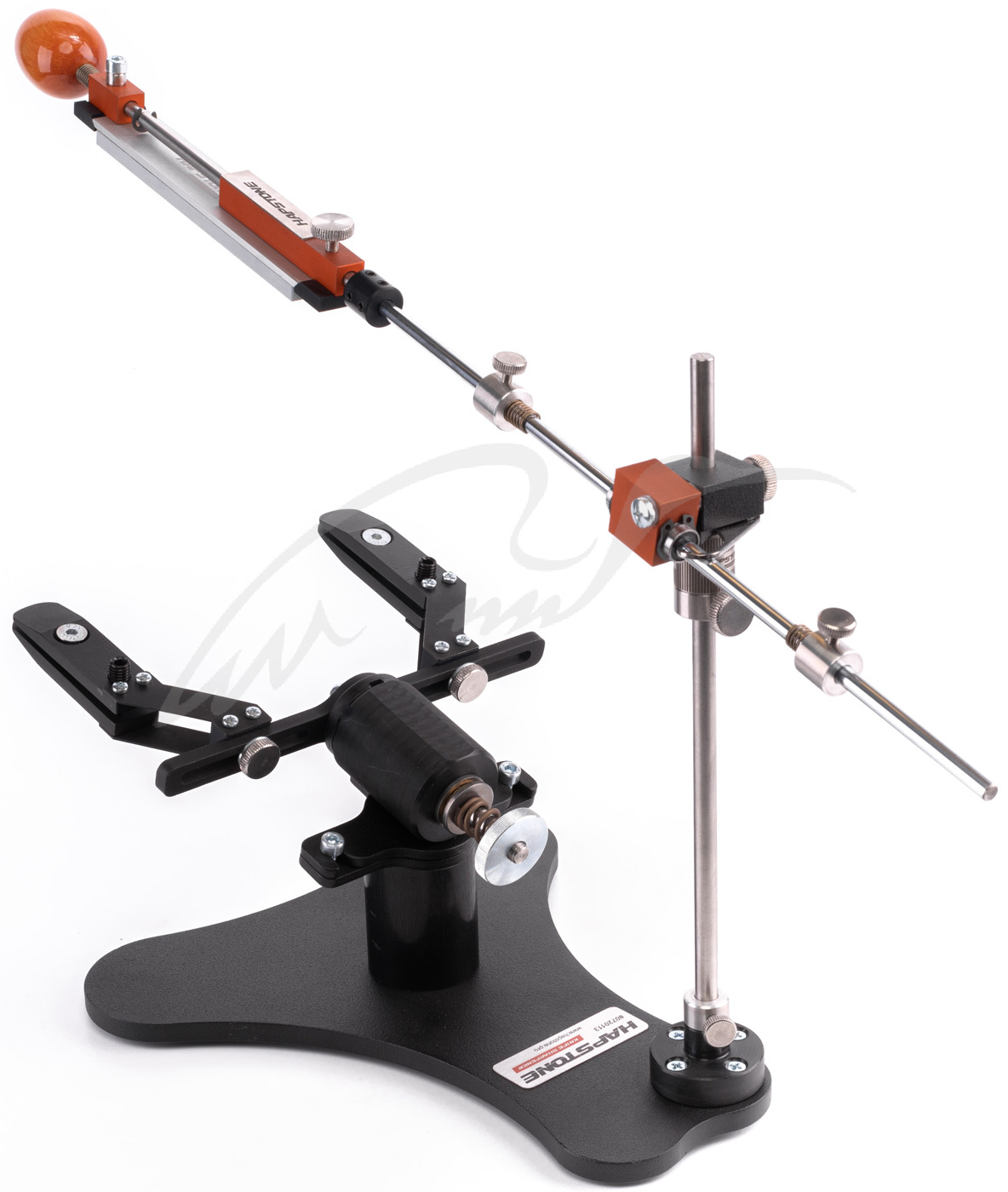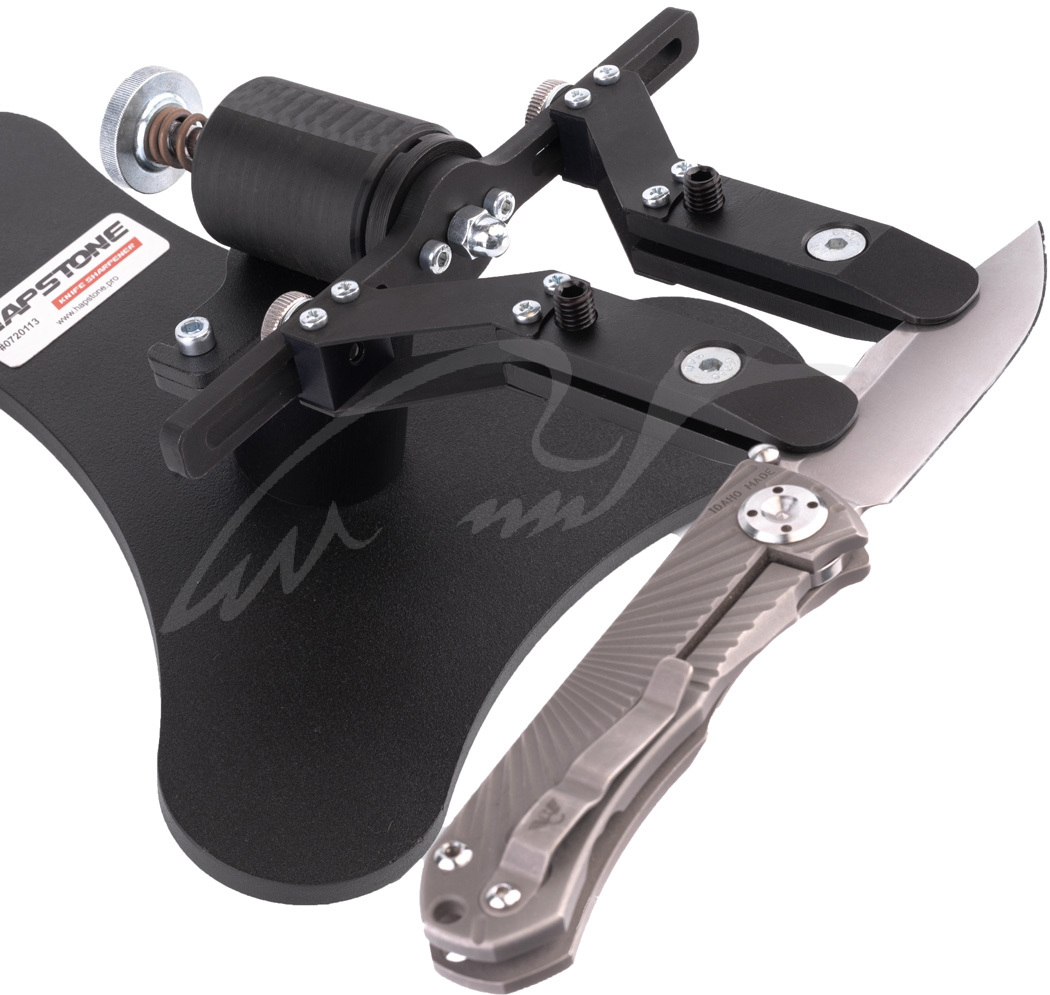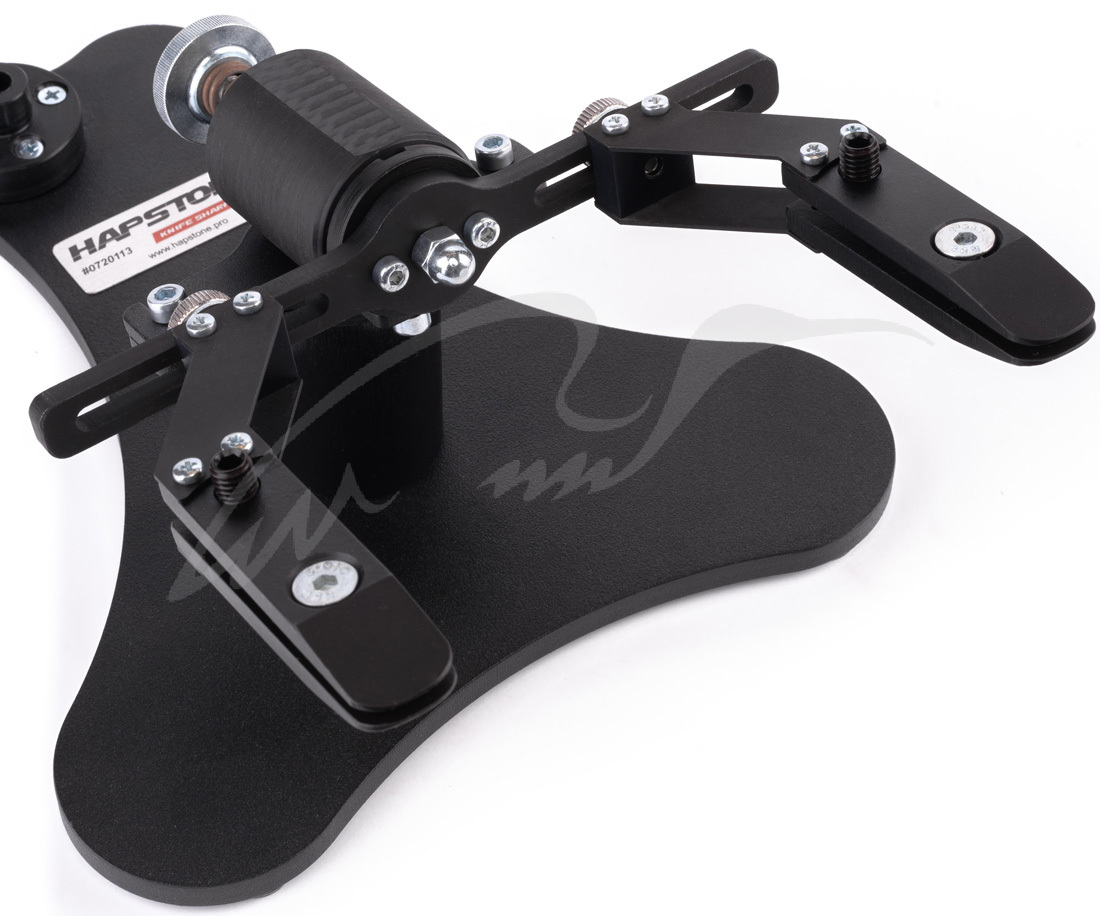 Точильные системы Hapstone разрабатывались для того, чтобы обеспечить максимально точную заточку режущей кромки любого ножа, вне зависимости от его размеров, длины клинка и вида стали. Основа системы массивная, стальная, ножки дополнены резиновыми накладками – таким образом, устройство не скользит по столу во время рабочего процесса. Легкая горизонтальная штанга несет на себе универсальный держатель камней и место для монтажа цифрового угломера, управляется она удобной деревянной ручкой. Муфта точной корректировки угла вращается очень плавно. Шарнирный узел оснащен линейным подшипником, что минимизирует трение и обеспечивает ровное скольжение штанги. Есть парковочный крюк.
