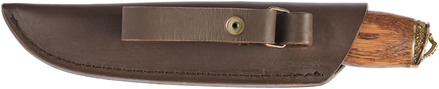 Нож R.A.Knives «Мисливець», в полном соответствии со своим названием, создан для охотников и без лишних деталей. Клинок из стали N690 или из 50Х14МФ, рукоять удобная, с утолщением к краю и мельхиоровыми ограничителем и навершием. В одной из версий ножа рукоять выполнена из сочетания кленового капа и полимера. Узор же на ней – не тонкая проволока, а соты из металла, уходящие внутрь на всю глубину. В другой версии рукоять из цельного бруска дуба и с отверстием под темляк в навершии.