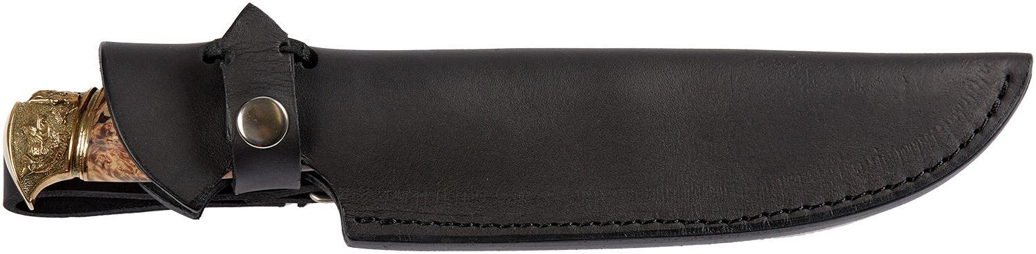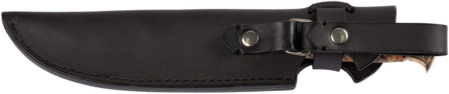Для удобства ношения нож снабжен кожаными ножнами с поясным креплением.
