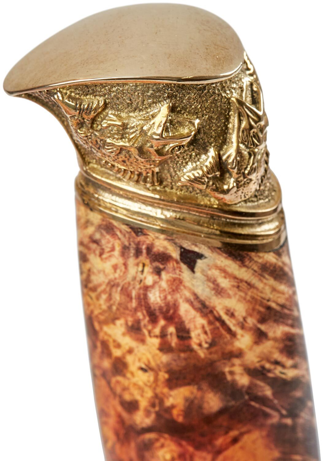Рукоять выполнена из капа клёна с небольшим ограничителем и навершием из мельхиорового художественного литья. Форма рукояти имеет широкое "брюшко" и навершие, что образует характерную эргономичную впадину возле ограничителя. Это простая и удобная форма, которая, при широком разрешении хвата любой стороной, имеет внешнюю эстетическую привлекательность.