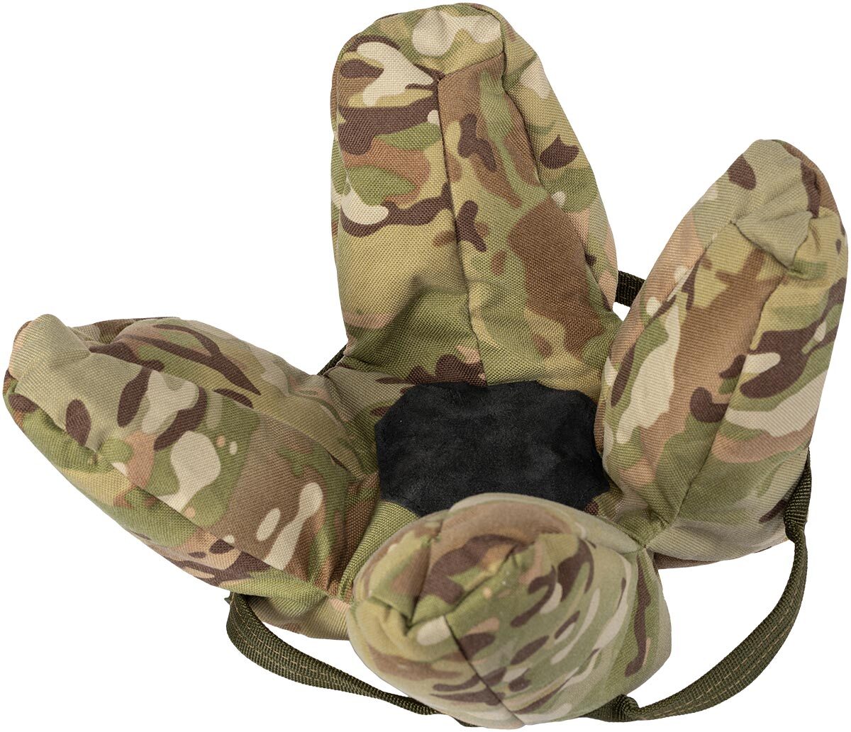 В малом баррикадном мешке есть нескользящие накладки, затяжка на велкро для надежного крепления к оружию и петля для крепления к рюкзаку. Наполнение - пластиковые гранулы.