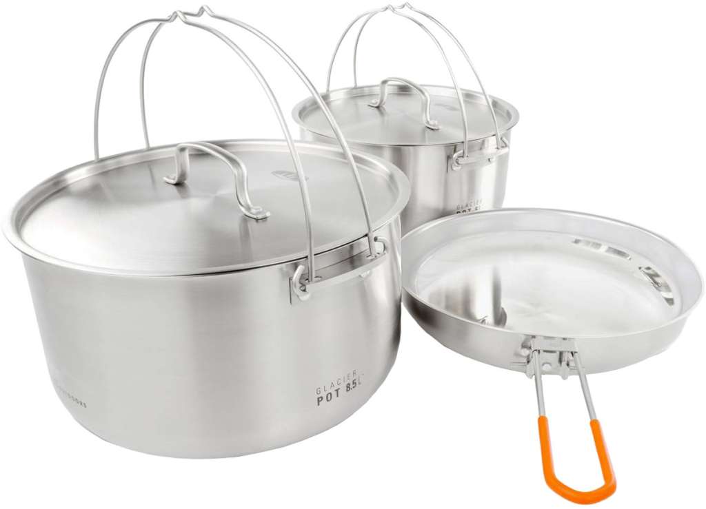 Набор посуды GSI Glacier Stainless Troop Cookset - современная облегченная посуда для приготовления пищи в полевых условиях. В набор входит котелок на 8.5 л, кастрюля - 5 л, 2 крышки и сковорода диаметром 25 см. Все приборы выполнены из прочной долговечной стали, которая не подвержена коррозии. Более того все приборы можно мыть в посудомоечной машине, поэтому все будет блестеть как новое долгое время. Для удобства при транспортировке боковые ручки складываются, и набор упаковывается по типу матрешки. Ручка на сковороде оснащена вставкой, которая в процессе приготовления не нагревается и позволяет спокойно брать горячую сковородку в руки.