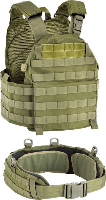 Тактический жилет с возможностью установки керамических бронепакетов, снабжен системой MOLLE для крепления различных подсумков и снаряжения, а так же эвакуационной петлей на спине. Плечевые и боковые ремни регулируются по размеру. Дополнительный штурмовой пояс может использоваться вместе с жилетом или отдельно от него. Пояс снабжен системой MOLLE для крепления различных подсумков и снаряжения.