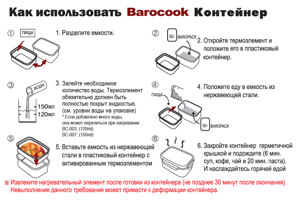 Лёгкий вес и простота в использовании это неоспоримые преимущества системы BaroCook. Где бы вы не находились - на рыбалке, в походе, на работе - инновационная технология абсолютно безвредная как для человека, так и для природы, обеспечит вас горячей пищей без лишних затрат.