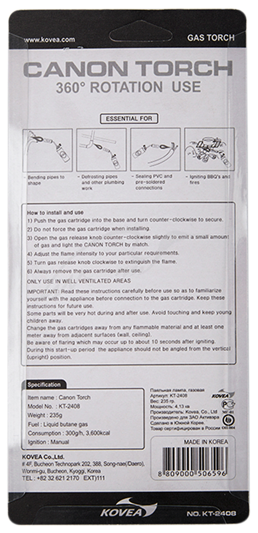 Резак Kovea Canon Torch - газовый инструмент широкого применения. Изделие выполнено в виде паяльной лампы. Применяется для розжига костров, каминов, выжигания сорняков, при строительных работах. В конструкции приспособления предусмотрена плавная регулировка толщины пламени. Питание осуществляется ло газового картриджа цангового типа.