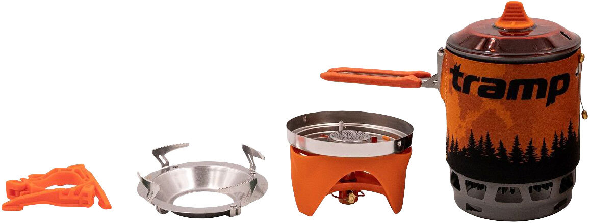 Система Tramp предназначена для приготовления и разогрева пищи в полевых условиях. В комплект входит котелок с неопреновой накладкой, объемом 800/1000 мл (в зависимости от выбранной модели), который оборудован складывающейся ручкой и интегрированным ветрозащитным экраном, крышка, подставка под баллон и таганок, для использования с любой другой посудой. Газовый баллон не входит в комплект. Все составляющие набора выполнены из прочных и долговечных материалов: нержавеющая сталь, алюминий, силикон (на ручке котелка) и неопрен. С помощью данной системы турист сможет в любых условиях разогреть или приготовить еду на одного или двух человек. Коэффициент полезного действия составляет 74%. Благодаря интегрированной ветровой защите экономится около 30% топлива и еда готовится быстрее. Для удобства во время транспортировки все комплектующие набора компактно помещаются в котелок.