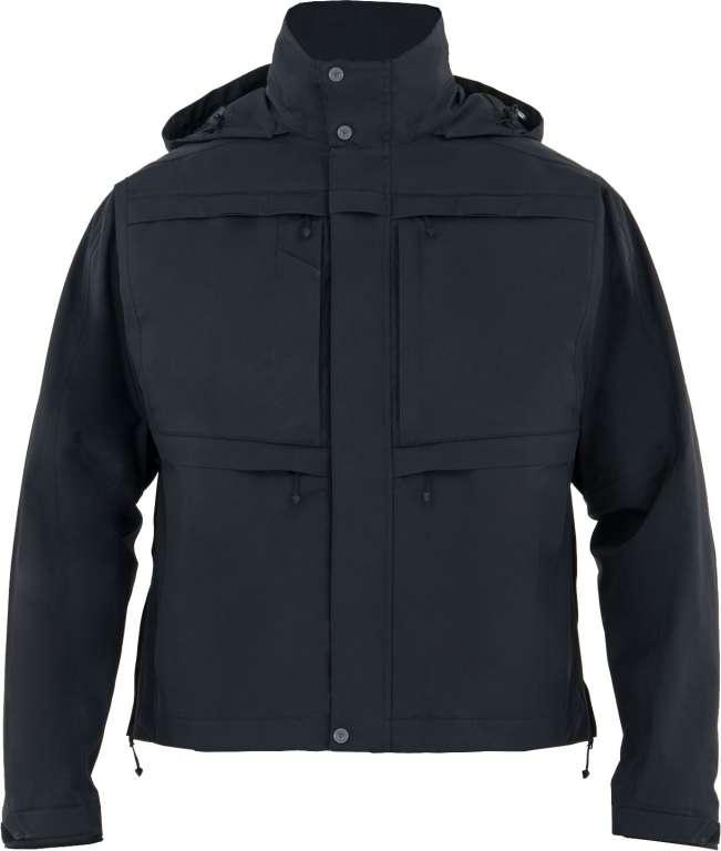 Верхний слой тактической куртки (100% нейлон) имеет два нагрудных кармана, два поясных кармана, два нагрудных скрытых кармана на молнии и один дополнительный карман на спине, в котором располагается крепление для идентификационных бейджиков. В нижней части спины предусмотрен один большой карман на молнии, в который при необходимости можно поместить головной убор, перчатки или быстро сбросить пустой магазин от оружия. Входы в карманы оснащены защитным клапаном для предотвращения попадания воды и мусора. Манжеты куртки регулируются по объему с помощью липучки. Под руками расположены вентиляционные отверстия на застёжке - молнии, с помощью которых без проблем адаптируется температурный режим куртки. Имеет съемный капюшон с козырьком. Капюшон оборудован регулировкой по объему и вставкой, позволяющей придать и зафиксировать форму козырька. Наличие быстрого доступа к оружию или спецсредствам, носимым на поясе.