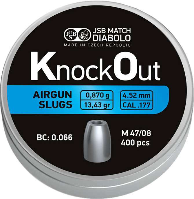 Тяжелые пули JSB Knock Out Slugs можно соотнести с классическими пулями для огнестрельного оружия Hollow Point благодаря их профилю и выемке на носике. Если добавить к этому материал - мягкий свинец, из которого отлиты пули - на выходе мы получим высокую экспансивность и хорошую баллистику.
