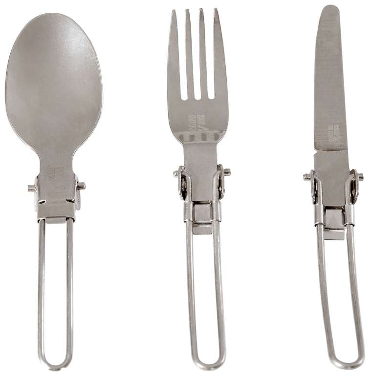 Набор состоит из 3 основных инструментов, необходимых для приема пищи: ложки, вилки и ножа. Приборы выполнены из пищевой нержавеющей стали, имеют складную конструкцию и фиксатор для блокирования в рабочем положении. В целях уменьшения общего веса, ручки сделаны не из цельного куска стали, а пустотелыми. Набор столовых приборов Skif Outdoor Trinity комплектуется нейлоновым чехлом на липучке для удобства хранения и транспортировки.