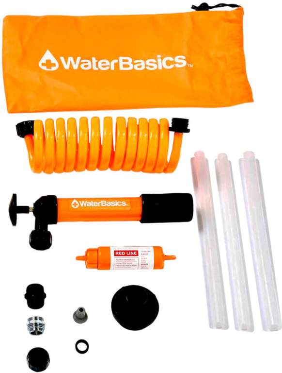 WaterBasics Emergency Pump and Filter Kit - комплект фильтрационной системы для использования в домашних условиях во время чрезвычайных ситуаций. Данный комплект упрощает технологию слива воды из бочек. Подсоединив шланг с ручным насосом к контейнеру для хранения воды, откачивайте и используйте воду. Встроенный фильтр - Series II RED Line фильтрует воду и не пропускает бактерии, вирусы, Cryptosporidium, Giardia, хлор, химикаты, вкусы и запахи. Данная система сертифицирована по американскому стандарту - EPA, NSF/ANSI и стандартам агентства по охране окружающей среды США.