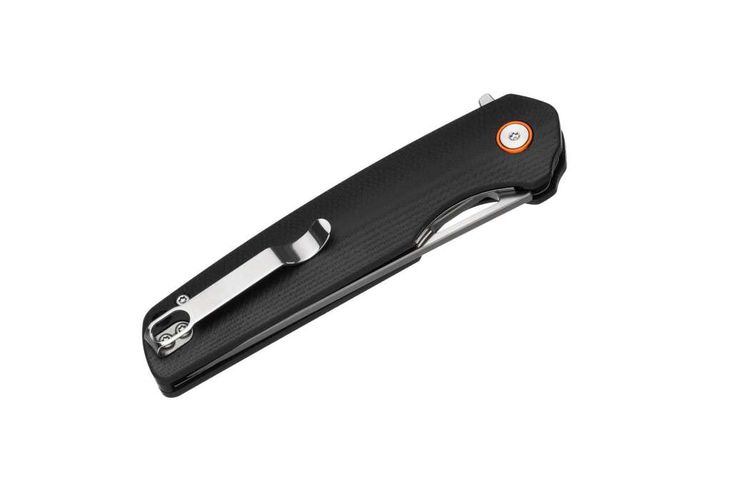 Клинок має профіль прямий обух та оригінальну, дещо тантоподібну форму. Спуски від обуха. Товщина клинка – 3,4 мм. Іншими словами, перед нами компактний та міцний гаманцевий різак для сучасного городянина. У його конструкції є усі необхідні елементи та технічні рішення, характерні для ножів цього класу.